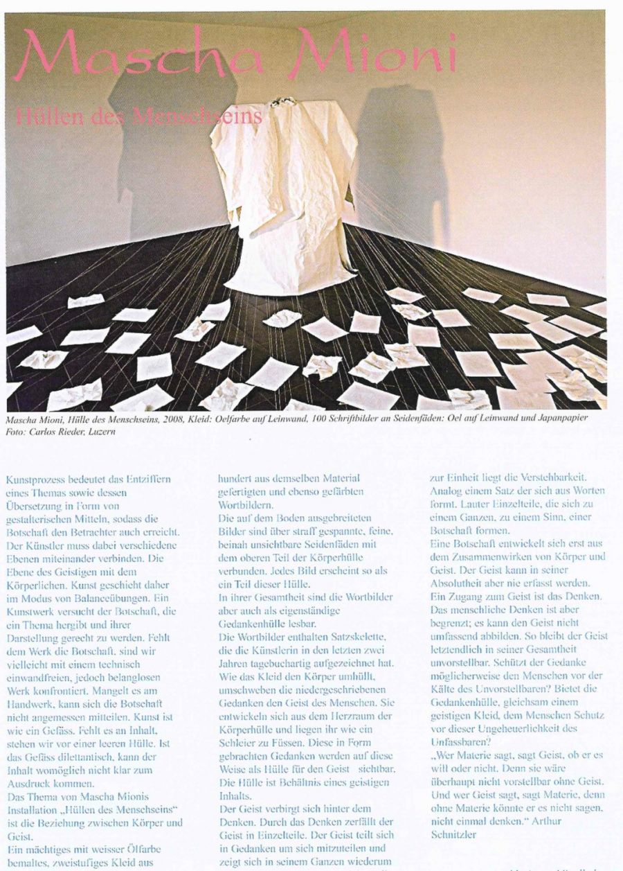 The art critic Marianne Mittelholzer writes in the art magazine contemporaryart futuro: "... The theme of Mascha Mionis installation "Skins of Humanity" is the relationship between body and soul. ....In the same way that a dress floats around the human body, the written thoughts hover around the mind of a human being. ..." (webmasters translation)