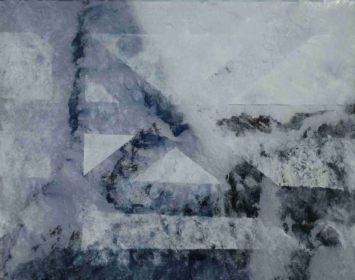 Experimenting with combining photography and painting to create a unique work Mascha Mioni painted with oil on four aerial photographs of the Swiss Alps and defamiliarized them. Aerial photographs by sport pilot Carlos Rieder, Lucerne,mounted on plexiglass, 4 x 50cm x 40cm, 2019.